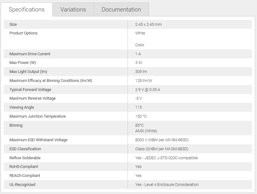 Designed to enable lower system costs for lighting manufacturers, the XLamp® XB-D LED doubles the lumens per dollar of previously available LEDs. Built on Cree’s SC³ Technology™ Platform, the XB-D White LED delivers up to 139 lumens and 136 lumens per watt in cool white (6000 K) or up to 107 lumens and 105 lumens per watt in warm white (3000 K), both at 350 mA and 85°C.