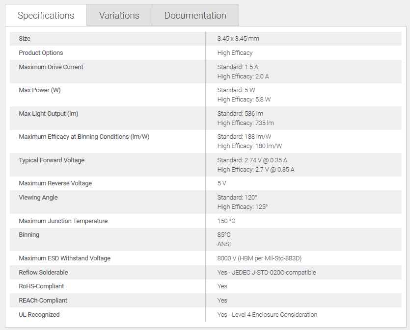Built on the SC3 Technology Platform, the XLamp® XP-G2 LED delivers up to 29% more lumens per watt and 2.5 times the lumens-per-dollar over the original XP-G, lowering system cost up to 57%. The new XP-G2 is optically compatible with the original XP-G – providing drop-in-ready performance enhancements to shorten the LED fixture design cycle and improve time to market. A new high-efficacy option is available, as well. The High Efficacy XP-G2 LED leverages Cree's latest high-power chip technology to deliver 25% more light output via a higher maximum current of 2000 mA, higher efficacy and lower thermal resistance. Combining high light output, reliability and efficacy, XP-G2 is optimized for directional, high-lumen applications, from indoor and outdoor to portable and lamp retrofits.